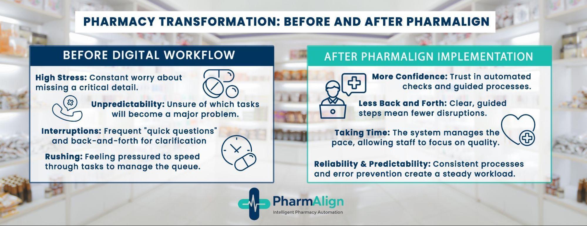 The path to workload reduction in pharmacy isn't about working faster; it's about fundamentally changing how the work gets done. Industry reports indicate that Canadian pharmacies are entering a $1.9 billion tech-driven transformation to shift away from manual tasks. That's where pharmacy automation technologies through PharmAlign AI, step in. These AI-driven systems learn from your team as well as a database of best practices specifically designed to automate the toughest administrative burdens, allowing your highly skilled team to pivot their attention from constantly managing processes to genuinely focusing on patient care.