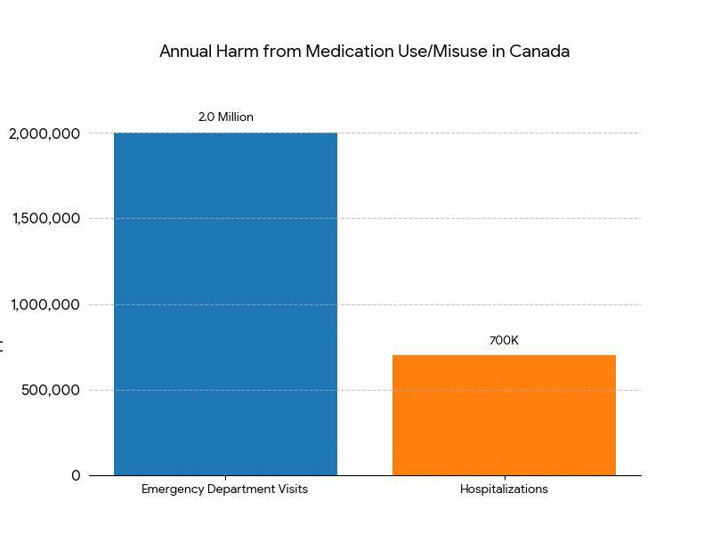 The impact of human fatigue and distraction is significant. Annually in Canada, harm from the use or misuse of medications leads to approximately two million emergency department visits and 700,000 hospitalizations each year costing over 1 billion dollars in healthcare spending. Adverse drug reactions are generally between the fourth and sixth cause of death in Canada. These are not merely statistics; they represent patient harm, impact families, and cost billions in unnecessary medical costs within our healthcare system.